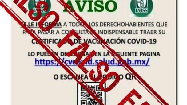 La falsa publicación que circuló en redes y grupos de mensajería instantánea, dice textualmente: “Aviso. Se le informa a todos los derechohabientes que para pasar a consultas es indispensable traer su certificado de vacunación COVID-19. Lo pueden descargar en la siguiente página o escanear el código QR”.