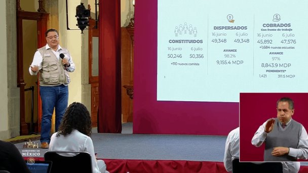 “La disposición y dispersión de los recursos, o sea esto significa las transferencias que se le hacen a las tesoreras de todos estos comités 49 mil 348 escuelas y 9 mil 155 millones de pesos, un avance del 98.2 por ciento, hemos avanzado ya con los que no solamente se les depositó, sino los que ya levantaron frentes de trabajo. Al 6 de julio, 47 mil 576, son 1 mil 684 nuevas escuelas que representan un 97 por ciento que ya están en actividad y como fuente de trabajo, una inversión en estos 47 mil 576 puntos, de 8 mil 843 millones de pesos”, precisó.