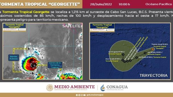 La Comisión Nacional del Agua (Conagua) prevé que Georgette continúe su trayectoria como tormenta tropical, alejándose del territorio mexicano, por lo que no representa peligro.