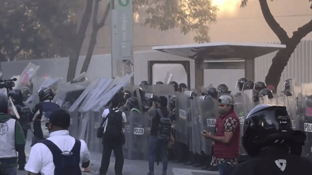 Videos que circulan en redes sociales, muestran a un grupo de anarquistas del llamado “Bloque Negro” enfrentando a los oficiales, quienes utilizan extintores para tratar de contrarrestar las agresiones de los sujetos.