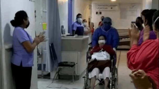 Entre porras y aplausos por parte del personal de salud, la paciente con cubreboca, entre lágrimas y llevando sus manos al corazón en señal de agradecimiento, se despide de los médicos.