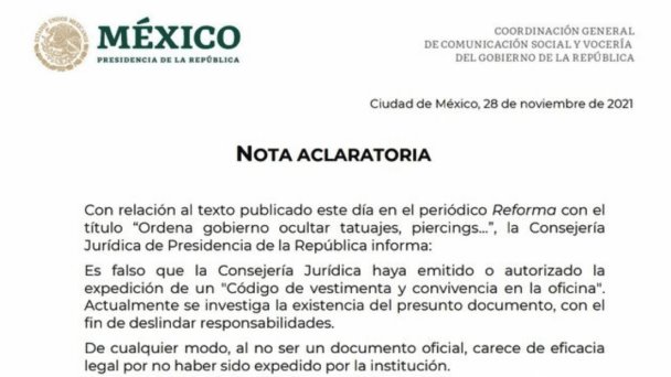 La Coordinación General de Comunicación Social y Vocería de la Presidencia de la República indicó que es falso que la Consejería Jurídica haya emitido la expedición de un “Código de vestimenta y convivencia en la oficina”, donde prohíba a sus integrantes ocultar tatuajes, piercings y opinar sobre el presidente López Obrador en redes sociales.