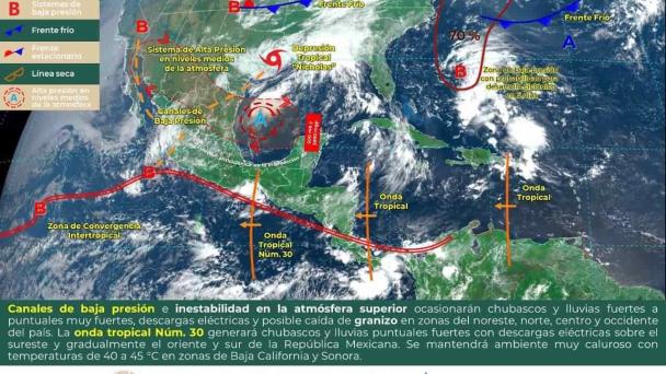 El Servicio Meteorológico Nacional informó que, derivado de la formación de canales de baja presión extendidos sobre el noreste y occidente de México, inestabilidad en la atmósfera superior y la Onda Tropical Número 30, se prevén lluvias muy fuertes de 50 a 75 milímetros en Aguascalientes, Guanajuato, Jalisco, Nayarit, Nuevo León, San Luis Potosí, Tamaulipas y Zacatecas, y fuertes de 25 a 50 milímetros en Chiapas, Durango, Estado de México, Oaxaca y Querétaro.