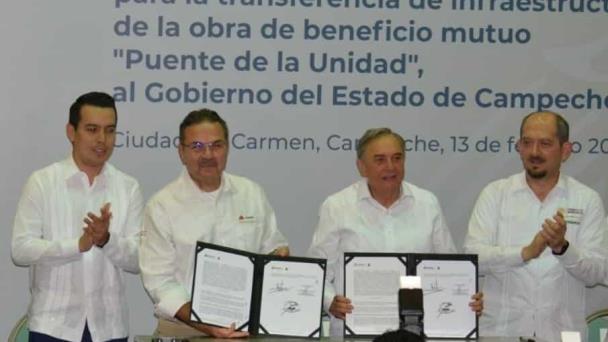 El director de PEMEX, Octavio Romero, y el gobernador de Campeche, Carlos Miguel Aysa, llevaron a cabo la firma del convenio modificatorio, para la transferencia de infraestructura de la obra de beneficio mutuo “Puente de la Unidad” al gobierno estatal.