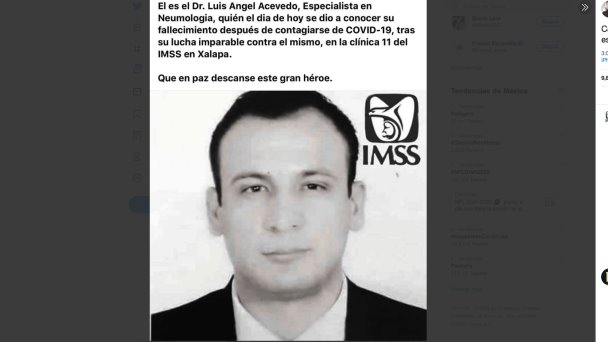 En su cuenta, hizo pública una fotografía en la que aparece el rostro de una persona y el logotipo del IMSS, además va acompañado de un texto que dice: “Él es el Dr. Luis Ángel Acevedo, especialista en Neumología, quien el día de hoy se dio a conocer su fallecimiento después de contagiarse de Covid-19, tras su lucha imparable contra el mismo, en la clínica 11 del IMSS en Xalapa. Que en paz descanse este gran héroe”, el usuario de la red social también escribe: “Cada RT es una oración por este héroe”.