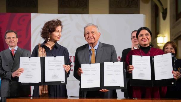 El convenio fue firmado por la secretaria de Cultura, Alejandra Frausto; la directora general de la UNESCO, Audrey Azoulay y por el presidente López Obrador.