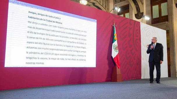 “Amigas, amigos de todo el país y habitantes de la Ciudad de México, me dirijo a ustedes con todo respeto para invitarlos a que en este mes de diciembre, que tradicionalmente ha sido de celebraciones por el Día de la Virgen de Guadalupe, las posadas, la Navidad, las comidas o cenas de fin de año, con compañeras o compañeros de trabajo, la espera del Año Nuevo con la familia y la llegada de los Reyes Magos, actuemos en este mes de diciembre con mucha responsabilidad para evitar contagios, porque la pandemia de COVID-19 sigue dañando, causando estragos”, exhortó.