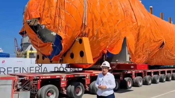 “Ya empezaron a llegar los primeros equipos a Dos Bocas, estas son las desaladoras de la planta combinada, llegaron cuatro equipos, cada uno pesa 250 toneladas, 38 metros de largo. Le agrademos mucho a todas las instituciones, al SAT, la Secretaría de Aduanas, API, por supuesto a Pemex y al IMP por toda la maniobra.