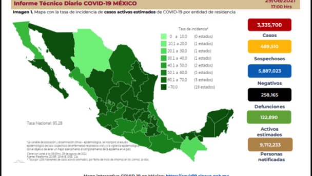 Con estas cifras, México acumula un total de 3 millones 335 mil 700 casos y 258 mil 165 muertes confirmadas.