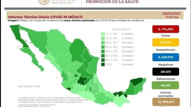 La Secretaría de Salud federal informó que de acuerdo al último corte, México acumula un total de 3 millones 714 mil 392 casos de coronavirus, así como 281 mil 610 defunciones vinculadas a dicha enfermedad.
