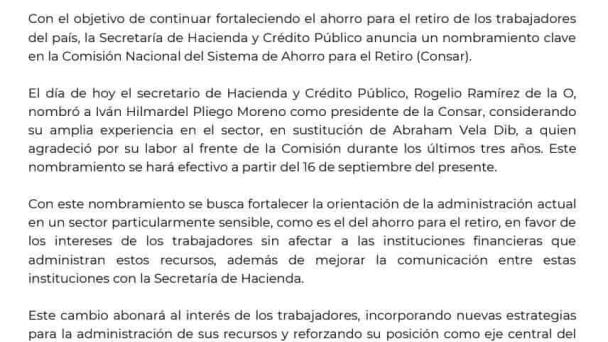 La SHCP afirmó que con este nombramiento “se busca fortalecer la orientación de la administración actual en un sector particularmente sensible, como es el del ahorro para el retiro. Este cambio abonará al interés de los trabajadores, incorporando nuevas estrategias para la administración de sus recursos y reforzando su posición como eje central del desarrollo de las mismas”.