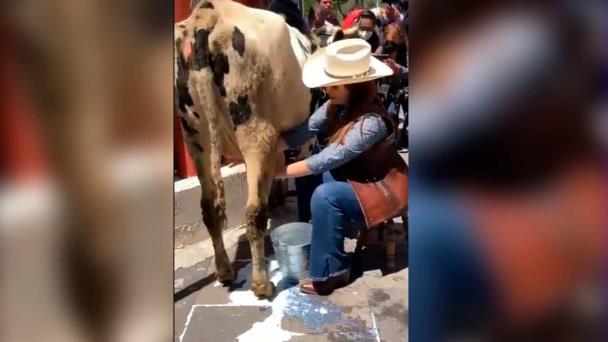 Ordeña diputada del PRI a vaca frente a la Cámara en exigencia de apoyos para el sector lechero