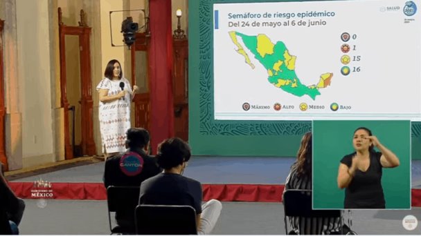 La directora del Centro Nacional para la Prevención y Control del VIH/SIDA, Alethse de la Torre Rosas, al presentar el informe técnico sobre el COVID-19 en México, informó que para el periodo que comprende del 24 de mayo al 6 de junio, dentro del semáforo de riesgo epidémico 16 estados estarán en riesgo bajo, es decir, en color verde, 15 en color amarillo, uno en color naranja y ninguno en riesgo máximo o color rojo.