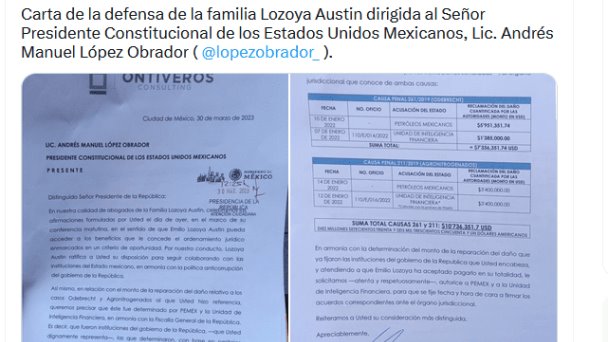 La defensa jurídica del exdirector de Pemex, Emilio Lozoya, a través de una carta respondió al presidente Andrés Manuel López Obrador, que el monto de 10 millones 736 mil dólares para cubrir la reparación del daño por los casos Odebrecht y Agronitrogenados no fue fijado por su cliente, sino por la Unidad de Inteligencia Financiera (UIF) y por Petróleos Mexicanos (Pemex).