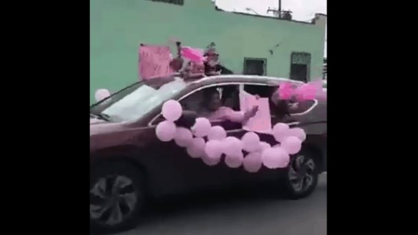 A través de un video circulado en redes sociales, se observa el recorrido de los vehículos adornados con globos de color rosa, y con varias personas a bordo, e inclusive, algunos de los conductores portan cubrebocas y saludan a la mujer embarazada que se ve, está a las afueras de su domicilio, acompañada de un hombre y una mascota.