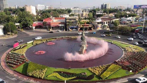 Pintan de rojo agua de 'La Minerva' en Guadalajara, en apoyo al 9M