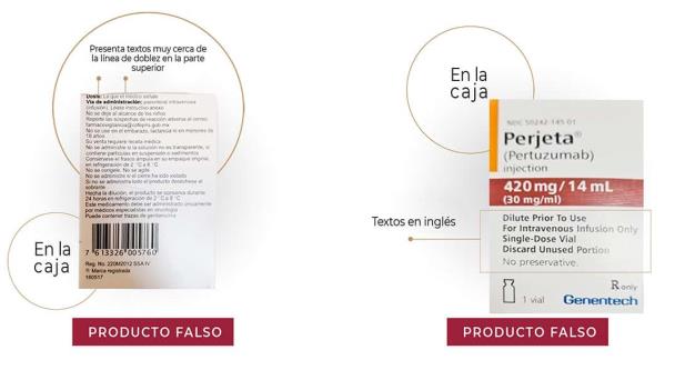 Precisó que la caja de los productos falsificados presenta textos muy cerca de la línea de doblez en la parte superior, textos en inglés y la ausencia de leyendas debajo de la fórmula; mientras que en el frasco, la etiqueta señala la concentración.