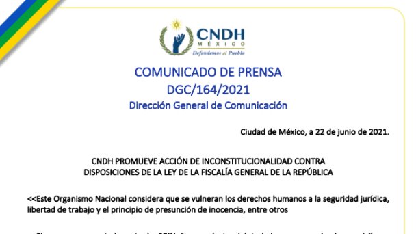 La Comisión Nacional de los Derechos Humanos presentó una acción de inconstitucionalidad contra la nueva Ley de la Fiscalía General de la República, al considerar que se vulneran los derechos humanos a la seguridad jurídica, de igualdad y no discriminación, libertad del trabajo, de acceso a un empleo público, así como los principios de legalidad y presunción de inocencia.