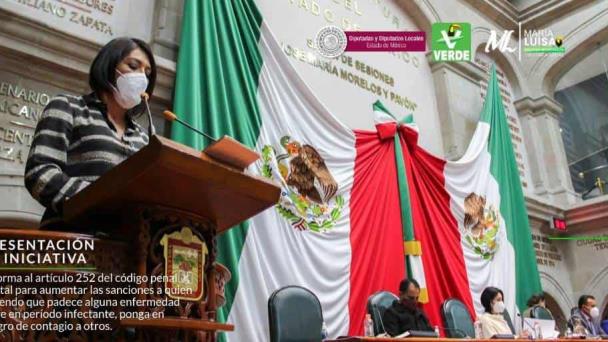 La diputada del PVEM en el Congreso del Estado de México, María Luisa Mendoza, presentó una iniciativa de reforma al Código Penal del estado, para aumentar el castigo en contra de quien deliberadamente contagie a otras personas de COVID-19 u otras enfermedades infecciosas.