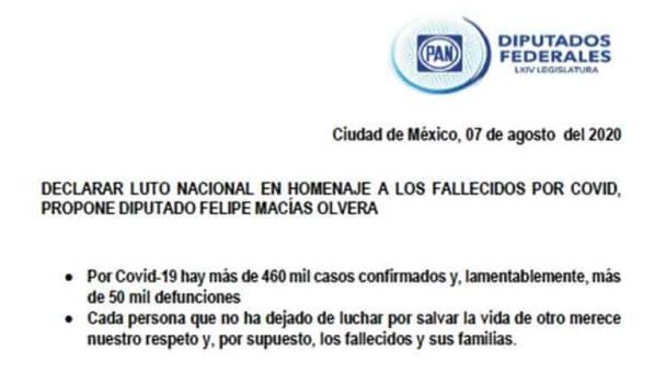 El diputado federal del Partido Acción Nacional, Felipe Fernando Macías, presentó un punto de acuerdo para exhortar al presidente Andrés Manuel López Obrador, declarar luto nacional en memoria de los más de 50 mil mexicanos que han perdido la vida a causa del COVID-19.