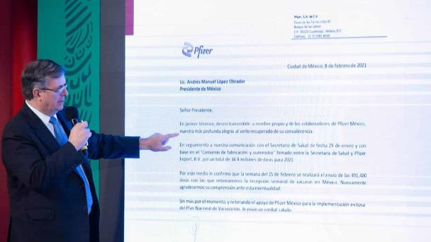 El secretario de Relaciones Exteriores, Marcelo Ebrard, informó que la próxima semana Pfizer reanudará el envío de vacunas contra el COVID-19 a México, luego de que la recepción desde Europa se suspendiera tres semanas.