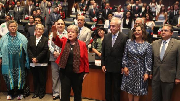 La presidenta de la Mesa Directiva del Senado, Ana Lilia Rivera, fue la encargada de tomar la protesta a Alicia Bárcena -bióloga por la UNAM; y con una maestría en administración por Harvard-, al igual que a Laura Elena Carrillo Cubillas, como subsecretaria para América Latina y el Caribe, y Joel Antonio Hernández García, como subsecretario para Asuntos Multilaterales y Derechos Humanos.
