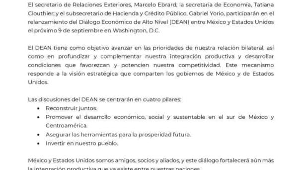 A través de un comunicado, señaló que en este relanzamiento del DEAN participarán el secretario de Relaciones Exteriores, Marcelo Ebrard; la secretaria de Economía, Tatiana Clouthier; y el subsecretario de Hacienda y Crédito Público, Gabriel Yorio.