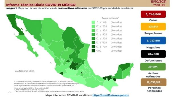 Con estas cifras, el país acumula un total de 3 millones 749 mil 860 casos y 284 mil 008 muertes confirmadas.