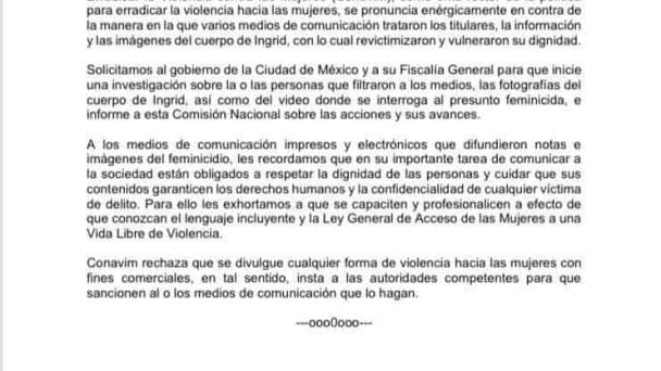 La Comisión Nacional para Prevenir y Erradicar la Violencia contra las Mujeres (CONAVIM), a través de un comunicado se pronunció en contra de la manera en la que algunos medios de comunicación, trataron la información y las imágenes del cuerpo de Ingrid, mujer que perdió la vida a manos de su pareja en la Ciudad de México.