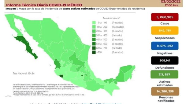 Con estas cifras, México acumula un total de 5 millones 068 mil 985 casos positivos y 308 mil 141 muertes confirmadas.