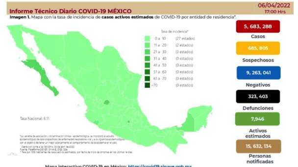 Con estas cifras, el país acumula un total de 5 millones 683 mil 288 contagios, así como 323 mil 403 fallecimientos confirmados desde el inicio de la pandemia.