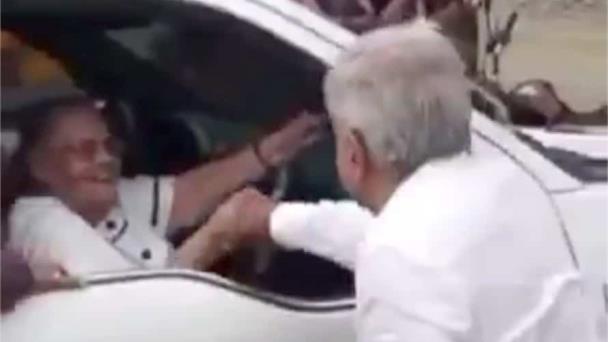 A través de un video que circuló en redes sociales, se aprecia al mandatario acercarse a una camioneta blanca donde estrecha la mano de una mujer adulta a la cual le dice que ya recibió su carta.