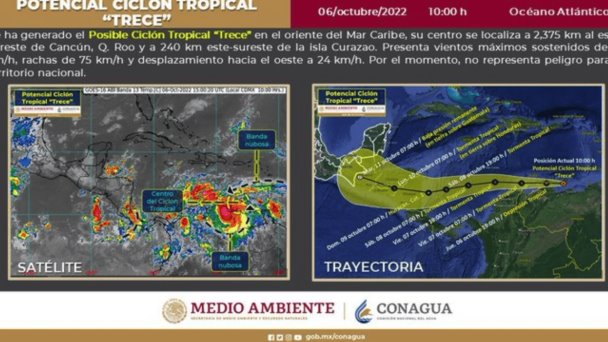 Por su parte, el potencial ciclón tropical Trece se formó a 2 mil 375 kilómetros al este-sureste de Cancún, Quintana Roo, y a 240 km al este-sureste de la isla Curazao.