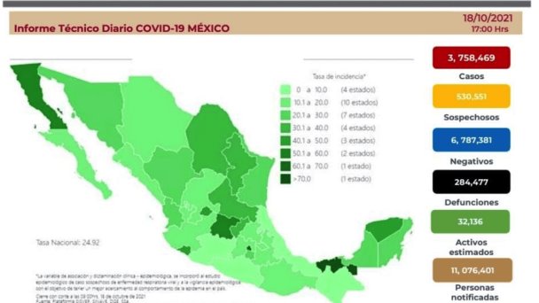 Con estas cifras, el país acumula un total de 3 millones 758 mil 469 casos y 284 mil 477 muertes confirmadas.
