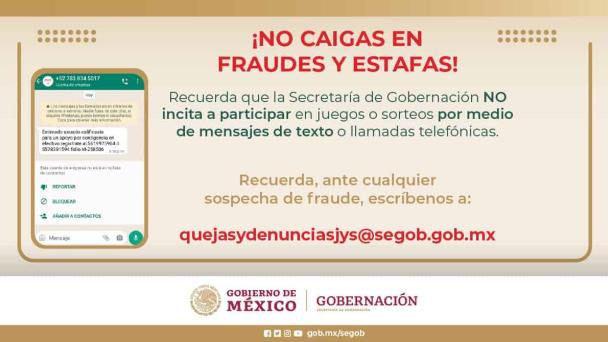 Ante cualquier sospecha de fraude, recomendó denunciar al correo electrónico quejasydenunciasjys@segob.gob.mx , para brindar asesoría y atención personalizada a cada asunto.