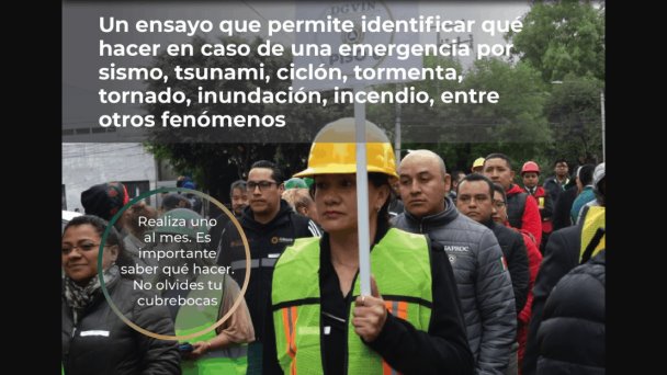 Agregó que, debido a que el simulacro se realizará en domingo, casi a medio día, cuando la gente se encuentra en sus viviendas o en espacios públicos, exhortó a la población a tener preparado su programa familiar de Protección Civil, considerando que todavía nos encontramos en pandemia, así como registrar sus inmuebles, a más tardar el 18 de septiembre, a través de la página web http://www.preparados.cenapred.unam.mx/blog/.