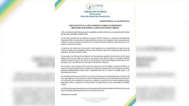En un comunicado, el organismo informó que tuvo conocimiento del caso del joven Francisco Villalba, de nacionalidad mexicana, quien perdió la vida como consecuencia del intento de robo de su bicicleta en Nueva York.