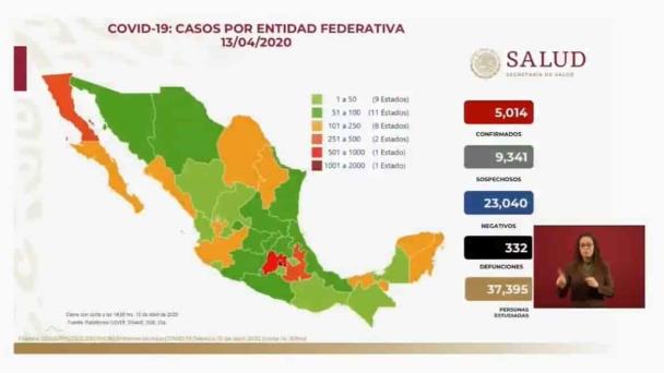 5 mil 14 casos confirmados de Covid-19, registra México con corte de este lunes, además suma 332 decesos y 9 mil 341 casos sospechosos, reveló en rueda de prensa la Secretaría de Salud federal.