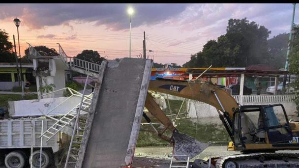 Un tráiler que transportaba maquinaria pesada para el Tren Maya derribó un puente peatonal en la comunidad de Nicolás Bravo, en el municipio de Othón P. Blanco, Quintana Roo.