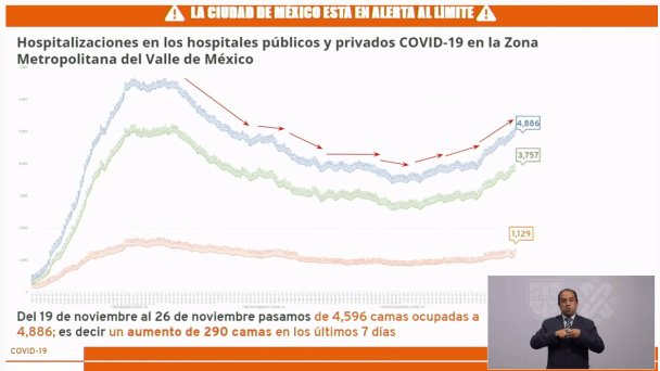 “Estamos hoy en 4 mil 486 hospitalizaciones en el Valle de México, esto incluye 22 millones de habitantes, 57 municipios conurbados con el Estado de México y 16 alcaldías, y hubo un aumento de 290 camas en los últimos días”, señaló.
