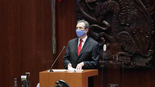 Al arrancar su exposición de motivos, el funcionario fue interrumpido por el presidente de la Mesa Directiva del Senado, Eduardo Ramírez Aguilar, quien le solicitó quitarse la mascarilla para que se pudiera escuchar mejor su exposición.