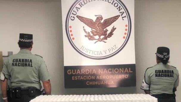 La Guardia Nacional aseguró 55 mil 800 cápsulas de pseudoefedrina en el Aeropuerto Internacional de Chihuahua, tras labores de inspección y vigilancia en el área de aduanas de la terminal aérea.