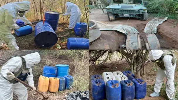 En operativos conjuntos de las fuerzas federales y estatales de Sinaloa localizaron 24 centros de almacenamiento y laboratorios clandestinos inactivos, asegurando un total de 34 mil 710 litros de precursores químicos para elaborar drogas sintéticas.