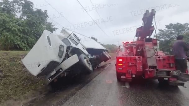 Un camión pesado que transitaba sobre la carretera Villahermosa-Macuspana, a la altura del kilómetro 8+400, cayó en una cuneta luego de que presuntamente el conductor se quedara dormido al volante.