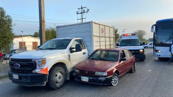 Testigos refirieron que el conductor de un vehículo modelo Tsuru buscó ganarle el paso a una camioneta de carga y al no poder hacerlo terminó por impactar al autobús de pasajeros procedente de Macuspana, terminando con daños los tres vehículos.