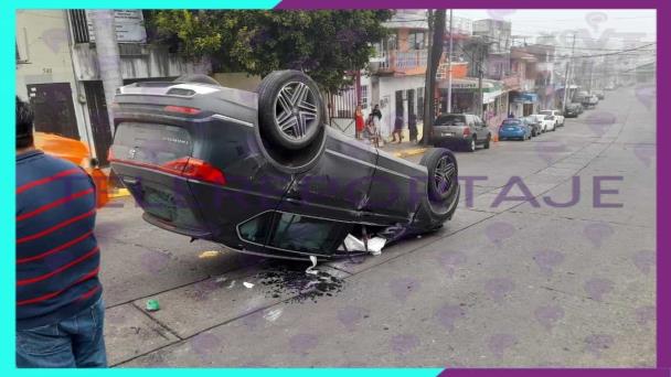 Una camioneta particular quedó volcada sobre la calle Ignacio Zaragoza, esto luego de haber sido colisionada por un automóvil tipo Versa que presuntamente se pasó la luz roja este día cerca de las ocho de la mañana.