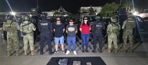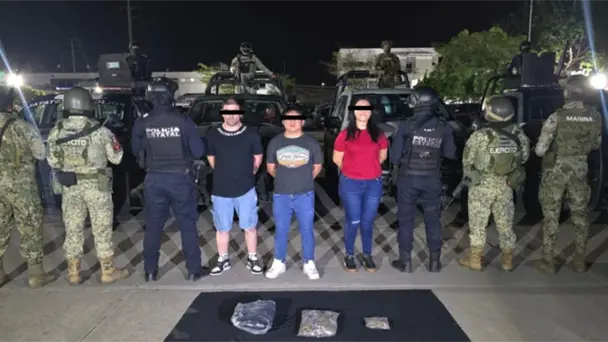 Más tarde, como resultado del despliegue operativo, en la calle General Ignacio Zaragoza, esquina con Venustiano Carranza, en la colonia Centro, fueron detenidos Denis "N", de 34 años, alias "El Chelo" y/o "Rezongón"; Ana "N", de 34 años, alias "La Tatuada"; y Juan "N", de 25 años, alias "El Capibara" o "Chaparro".