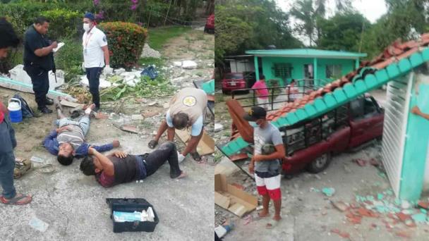 Camioneta se impacta contra casa y cae parte del techo sobre la unidad en Comalcalco