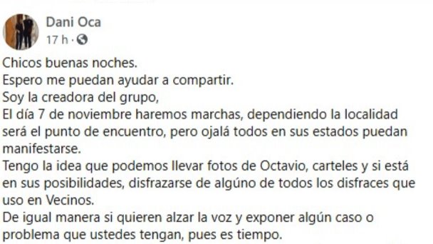 Asimismo, pidió que las personas que tengan la intención de participar en la marcha, lleven fotos de Octavio Ocaña y carteles, y de ser posible, disfrazarse de alguno de los personajes que usó en Vecinos.