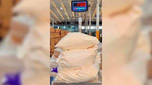 La Administración General de Aduanas informó que se aseguraron 25 kilogramos de clorhidrato de piperidina, percusor químico del fentanilo, en el Estado de México.